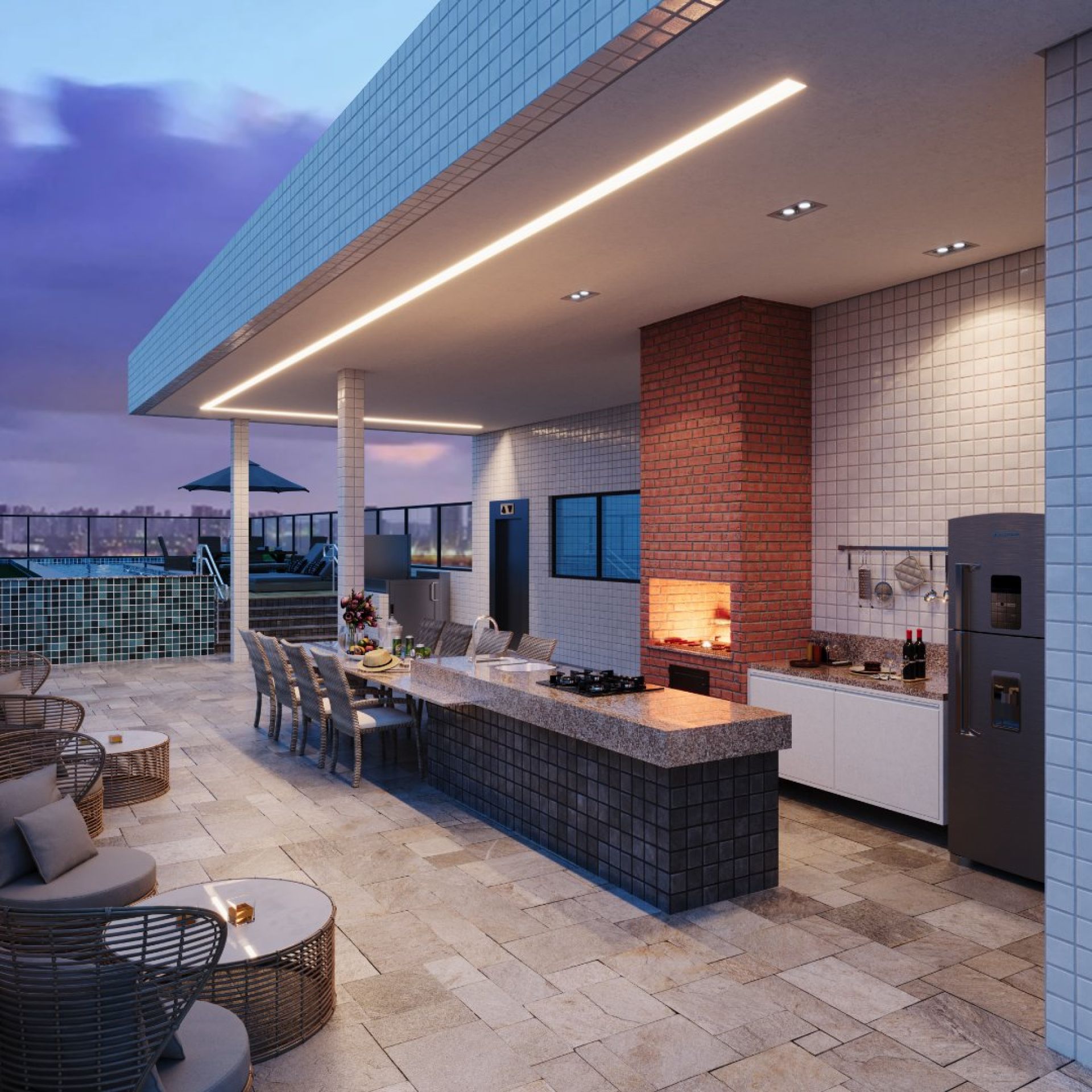 Terraço coberto integrando salão de festas ao espaço gourmet