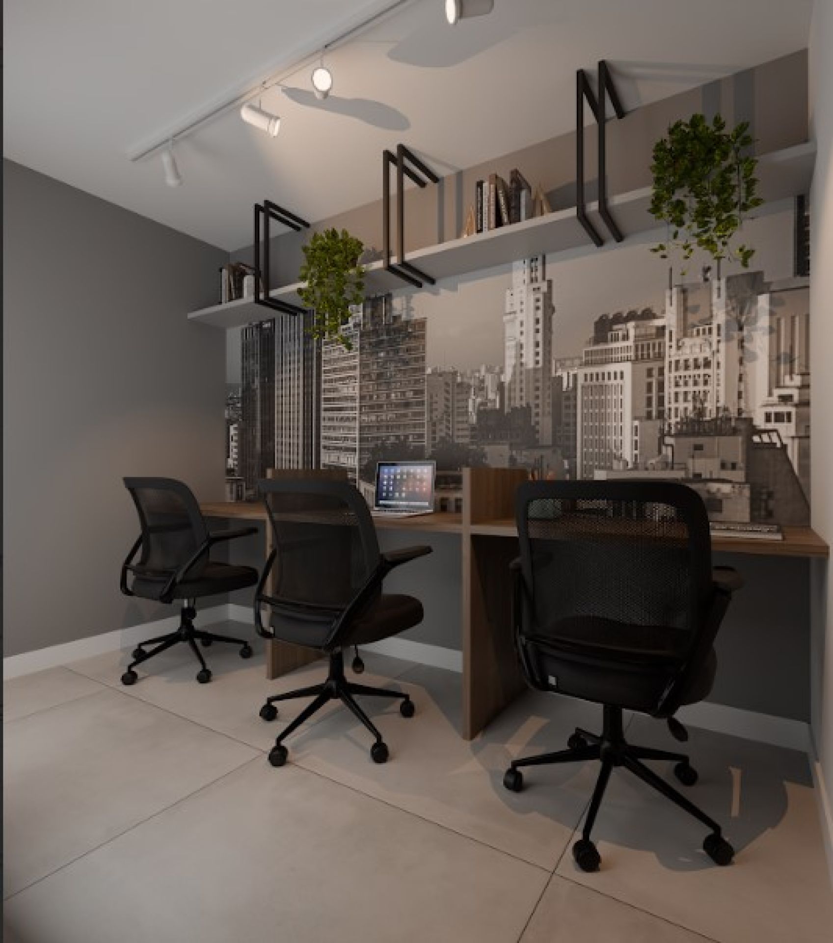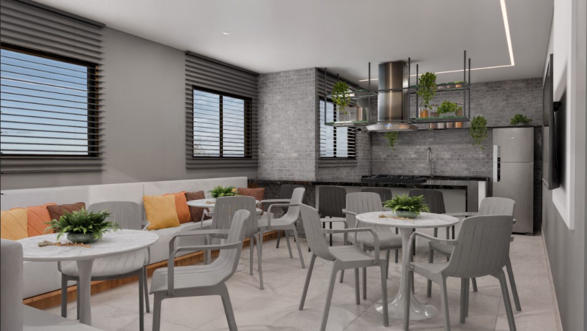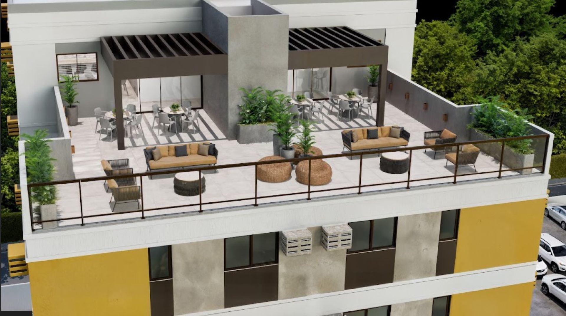 Rooftop com vista panorâmica e espaços de convivência